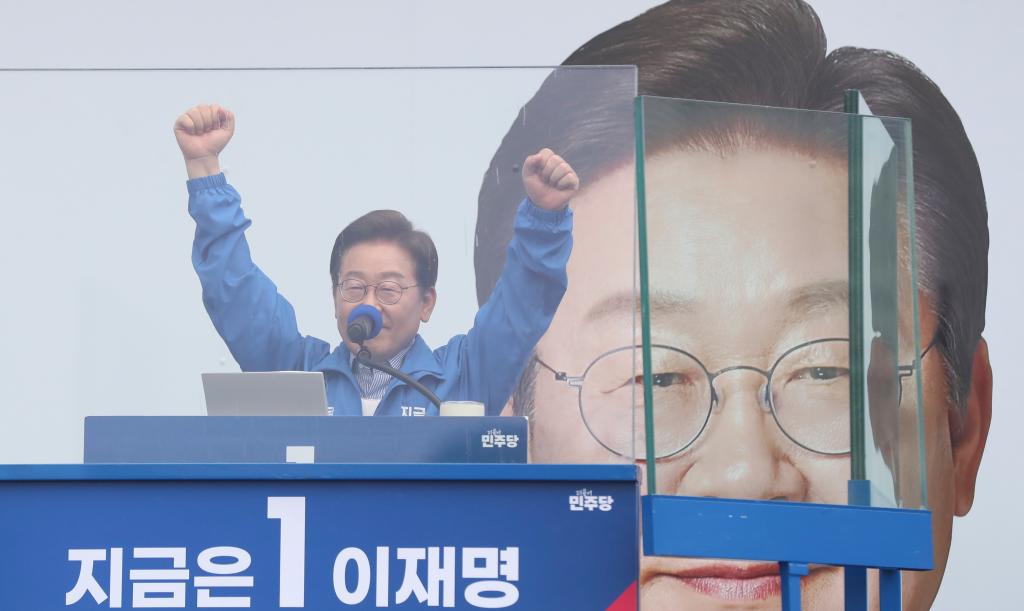 6月2日,韓國共同民主黨候選人李在明在首爾參加競選活動。新華社記者姚琪琳攝