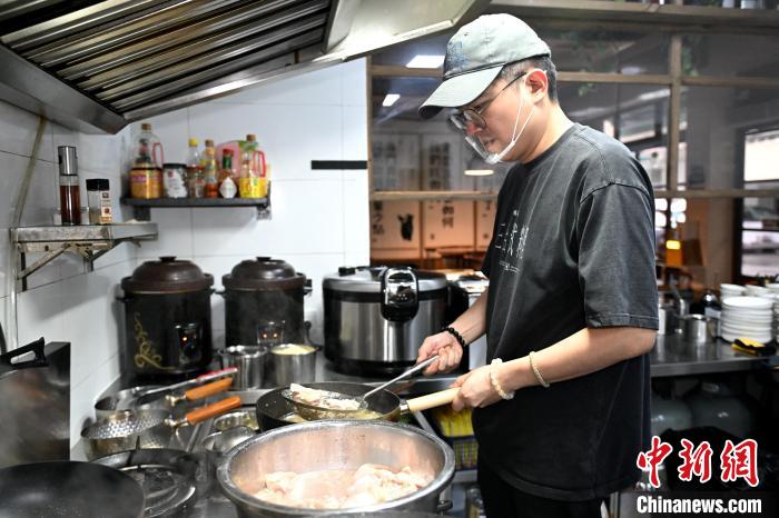 圖為陳駿凱正在店內廚房製作菜品。中新網記者 呂明 攝