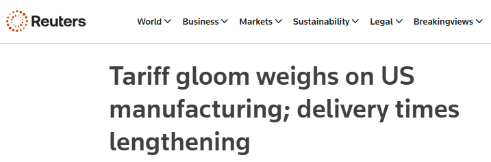 路透社近日的一篇報道認為,美國製造業5月連續第三個月萎縮,在關税影響下,供應商交付投入的時間是近三年來最長的,這可能預示着某些商品即將出現短缺。