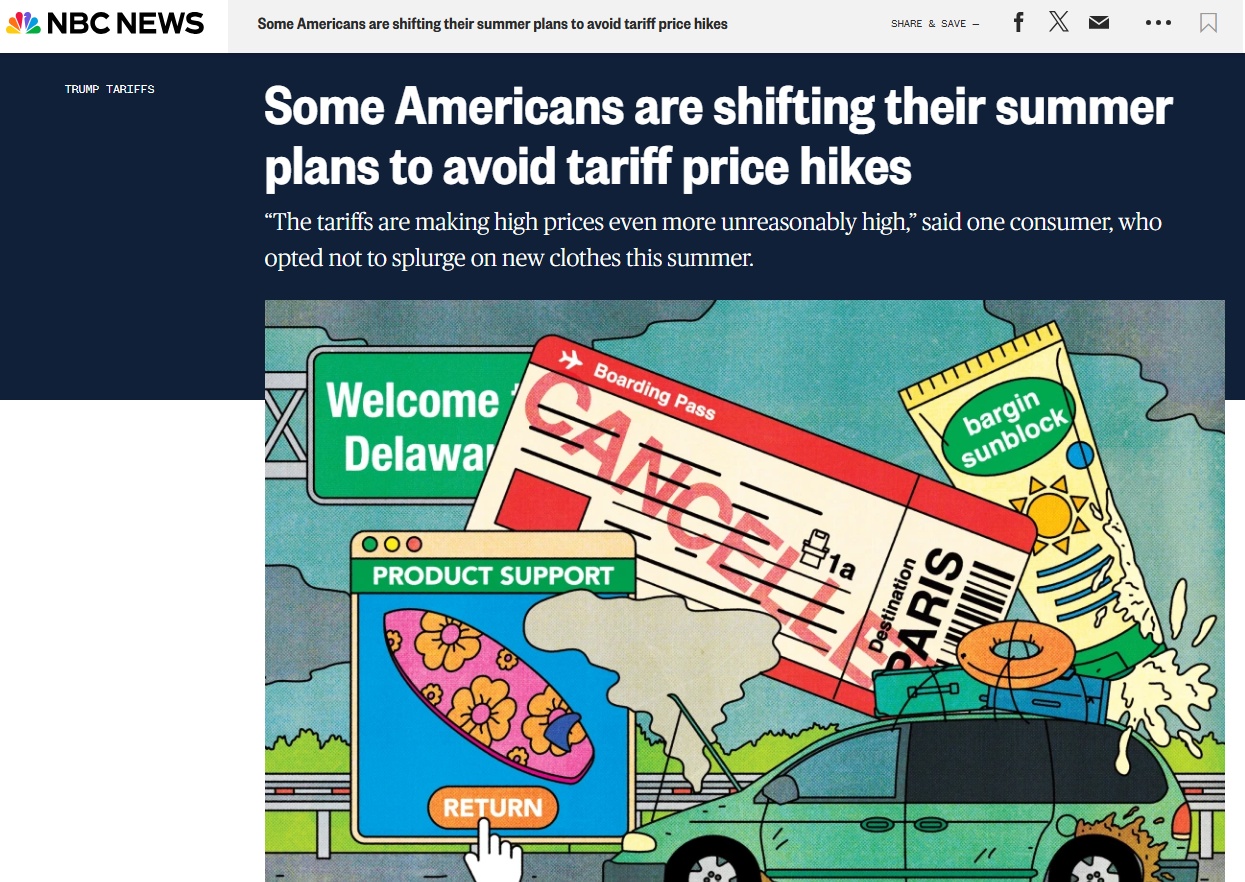 對於美國普通消費者而言,關税也讓他們今年的夏天和往年有所不同。美國全國廣播公司網站近日的一篇文章説,美國政府的關税政策,讓美國消費者對自身成本的擔憂持續加劇,他們不得不減少休閒活動和購物狂歡。