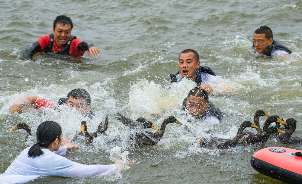 2025年5月31日,四川省樂山市五通橋區龍舟健兒參與“搶鴨子”。當日是端午節,各地羣眾以多種方式歡度假期。新華社發(孔勝攝)