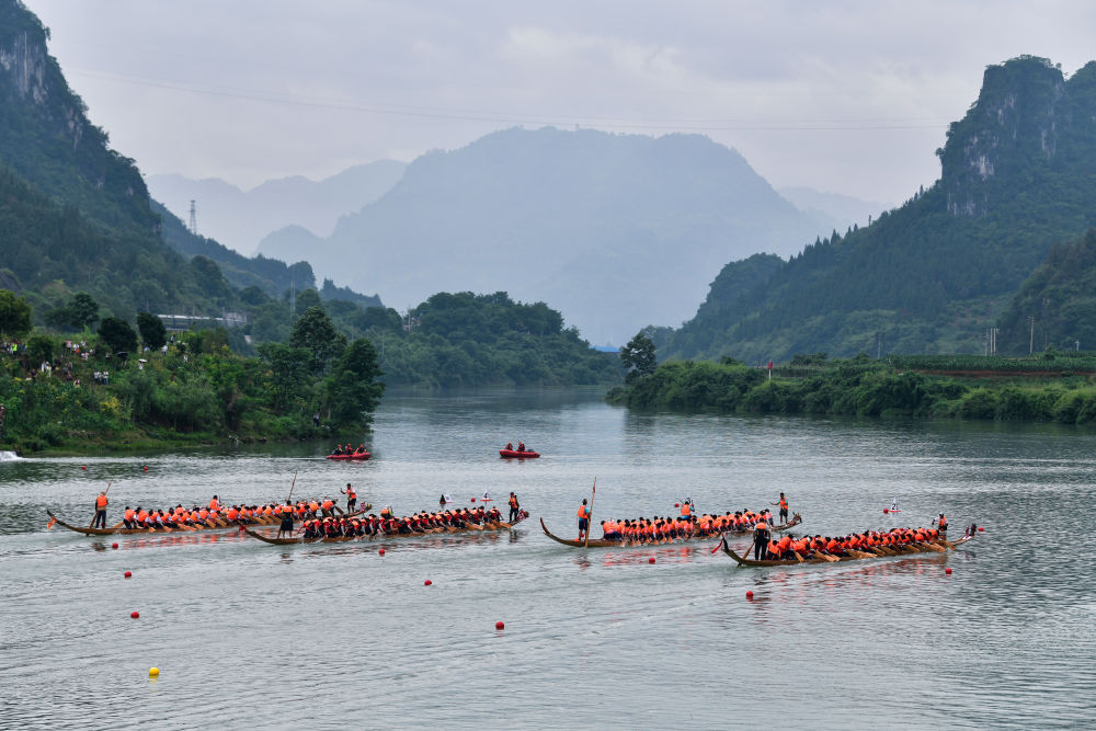 2025年5月31日,參賽隊伍在貴州省銅仁市碧江區錦江水域賽龍舟。5月30日至31日,2025年“我們的節日·端午”主題文化活動暨中國傳統龍舟大賽(貴州·銅仁·碧江)在貴州省銅仁市碧江區大明邊城龍舟基地舉行。來自銅仁市各區縣的60支龍舟隊齊聚錦江水域,進行為期兩天的水上競技。賽事期間,當地還舉辦了龍舟遊江、民族文化展演、端午誦經典等活動。新華社記者 楊文斌 攝