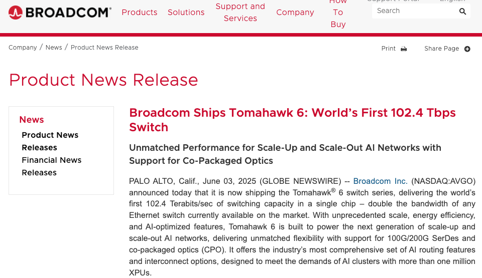 據稱,Tomahawk 6專為AI時代設計,其帶寬理論峯值達102Tbps,相當於每秒處理2.5萬部4K電影,較前代Tomahawk 5芯片實現6倍吞吐能力提升;架構創新方面,其支持100G/200G SerDes接口及共封裝光學模塊(CPO),兼容超大規模AI網絡運營商的定製化需求。