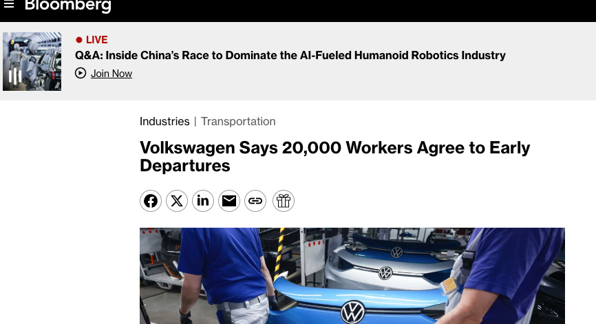 【環球網科技綜合報道】6月4日消息,據彭博社報道,為應對歐洲市場需求不均衡及加速電動化轉型,大眾汽車集團(Volkswagen AG)將在未來五年內通過自願離職計劃削減其德國本土約2萬名員工。這是該集團自2024年啓動“未來契約”(Future Pact)戰略以來,針對德國業務最大規模的結構性調整,旨在優化成本並提升運營靈活性。