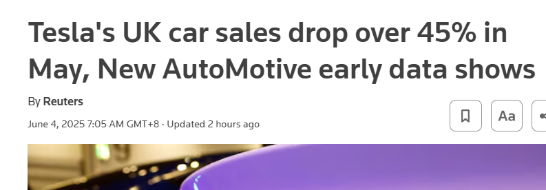 數據顯示,5月份英國新車銷量較上年同期下降逾45%,特斯拉在此市場表現欠佳。由於首席執行官埃隆·馬斯克的“政治因素”,特斯拉在英國的市場份額持續下滑。上個月,特斯拉在英國僅售出1,758輛汽車,與去年同期的3,244輛相比,降幅明顯。不過,從今年截至目前的整體情況來看,特斯拉依然是英國最暢銷的電動汽車品牌。