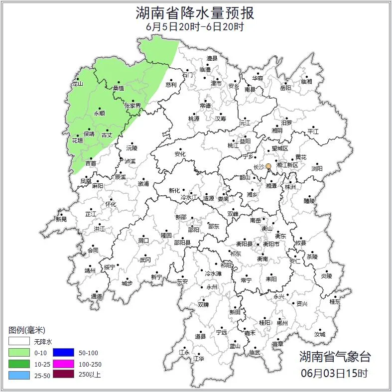 *5日晚上至6日白天,*晴天間多雲,湘西州、張家界、常德北部局地有陣雨;南風2~3級;最高氣温34~36℃,最低氣温21~25℃。