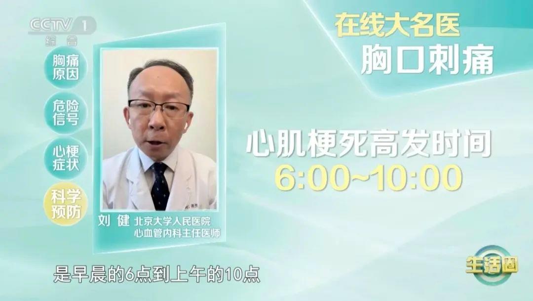 一天中,心肌梗死的高發時間為6:00~10:00。這是因為,早上起牀後,人體交感神經興奮,此時人體血壓升高、心率加快、心肌耗氧量增加,心肌處於相對缺血狀態。