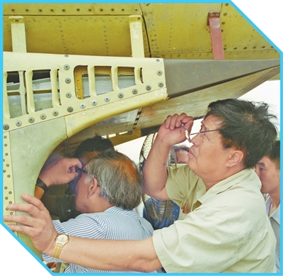 1997年,殲—10原型機01架發動機首次試車後,宋文驄(左)、楊寶樹在查看進氣道。李 勇攝