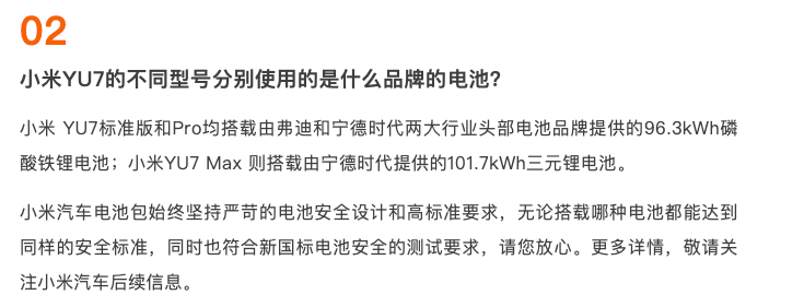 小米YU7電池配置揭曉:Max版採用寧德時代三元鋰電