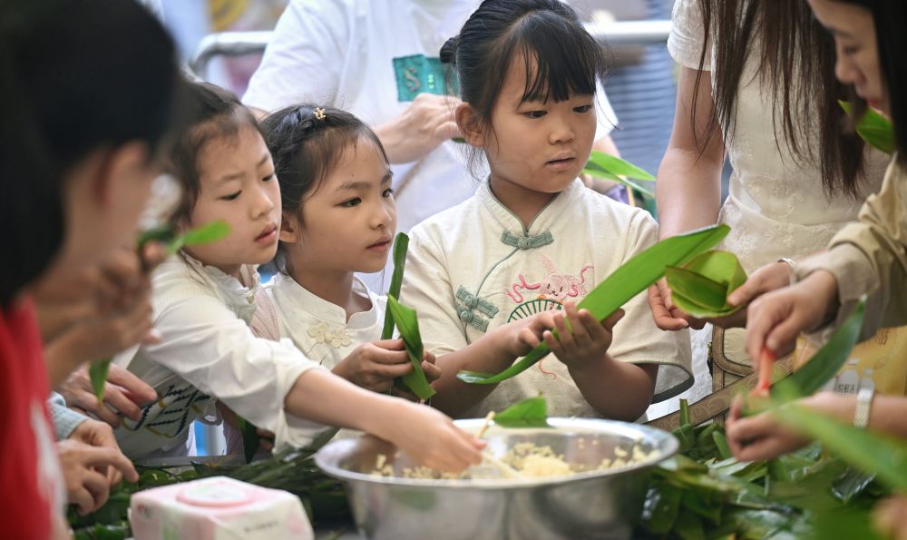 5月31日,在四川省瀘州市青少年服務中心,孩子們在學習包粽子。