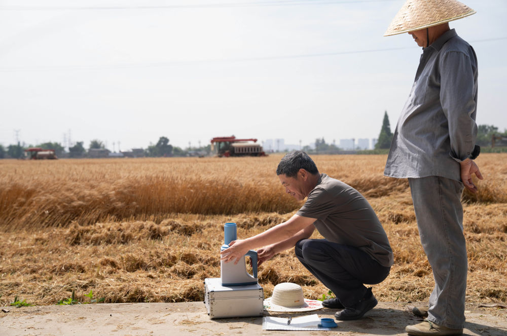 5月15日,工作人員在四川廣漢市南豐鎮雙福村測量剛收穫小麥的水分。