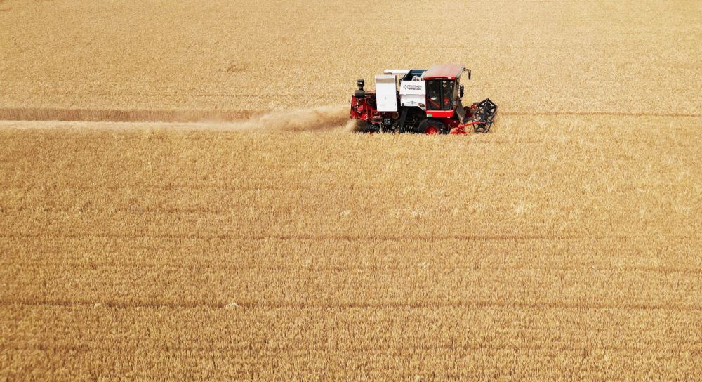 麥田金黃,農機手收割正酣,一排排小麥被整齊地切割、脱粒……廣袤農田一片繁忙景象。