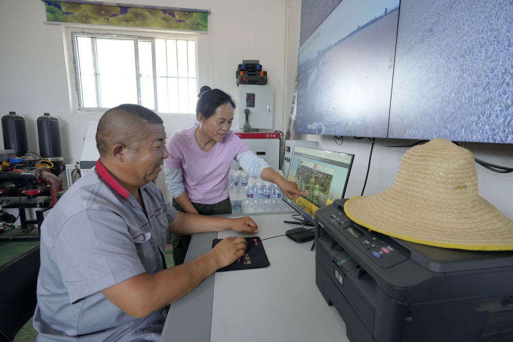 在山西省運城市鹽湖區解州鎮曲村,董會龍(左)和妻子範月親通過農機精準作業平台查看農機手作業情況。董會龍夫妻是運城市鹽湖區解州鎮的種糧大户。(5月27日攝)。
