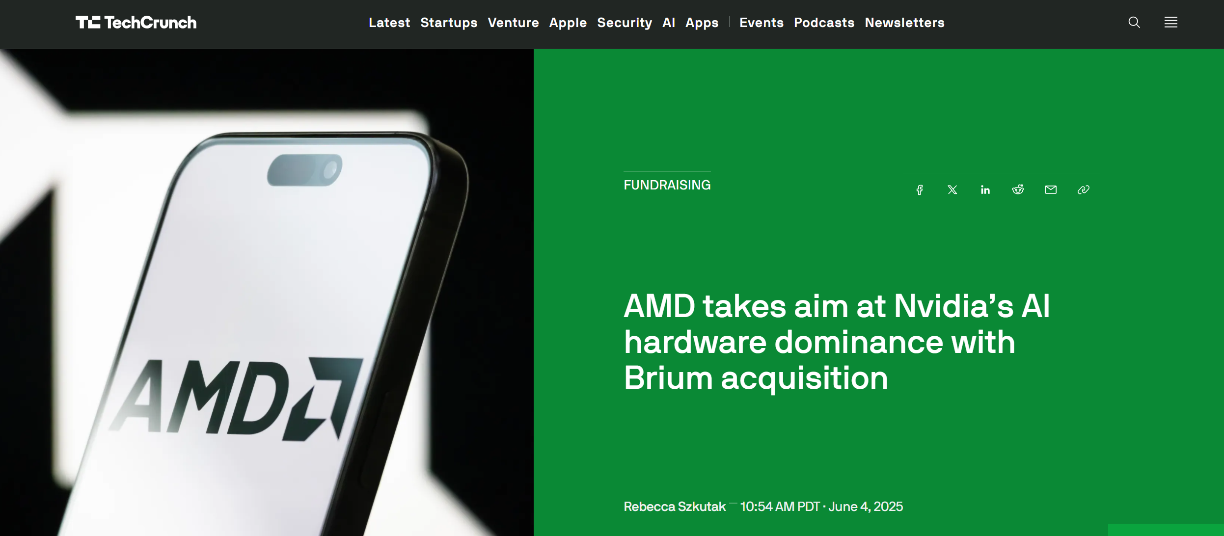 【環球網科技綜合報道】6月5日消息,半導體行業巨頭AMD於當地時間週三宣佈,成功收購人工智能軟件優化領域的初創企業Brium,此舉旨在強化其在人工智能硬件領域的競爭力,進一步推動開放型AI軟件生態系統的建設。儘管本次交易的具體條款尚未對外披露,但行業分析人士指出,這一戰略舉措有望對當前由英偉達主導的AI硬件市場格局產生重要影響。
