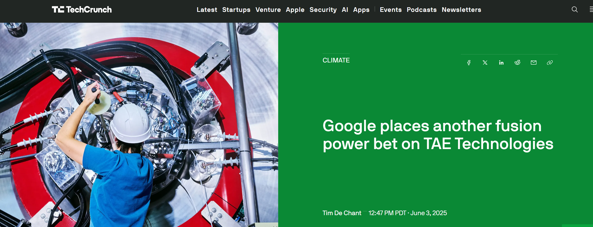 谷歌追加投資 TAE Technologies 助力核聚變發電研發