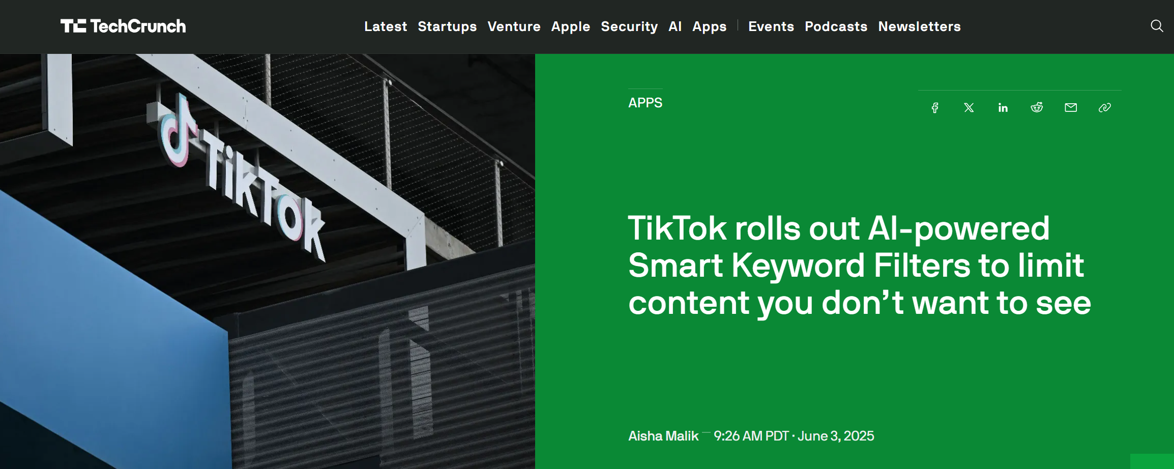 【環球網科技綜合報道】6月5日消息,短視頻平台TikTok近日宣佈上線“智能關鍵詞過濾器”功能,藉助人工智能技術進一步提升用户對個性化內容的過濾能力。這一創新功能在原有關鍵詞屏蔽基礎上,通過AI分析自動識別並攔截含有相近詞或同義詞的內容,幫助用户更精準地屏蔽“為你推薦”頁面中不想看到的信息。