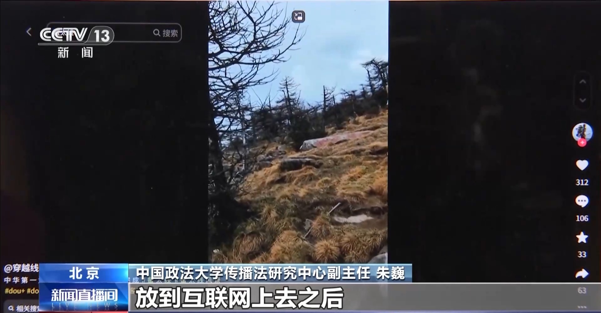 *中國政法大學傳播法研究中心副主任 朱巍:*通過這種野外探險的方式去獲取關注和流量,有了流量之後可以帶一些貨。比如説有一些户外用品,比如説像帳篷、旅遊鞋,包括衝鋒衣等等,所以他拍攝這個視頻的目的歸根到底還是一種商業目的。