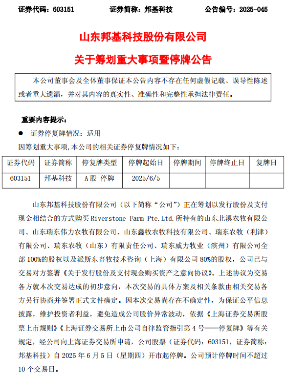 【環球網消費綜合報道】6月5日,邦基科技傳來重磅消息,公司已簽署《關於發行股份及支付現金購買資產之意向協議》,擬收購Riverstone所持有的7家生豬養殖相關公司。公司股票自6月5日(星期四)開市起停牌,預計停牌時間不超過10個交易日。