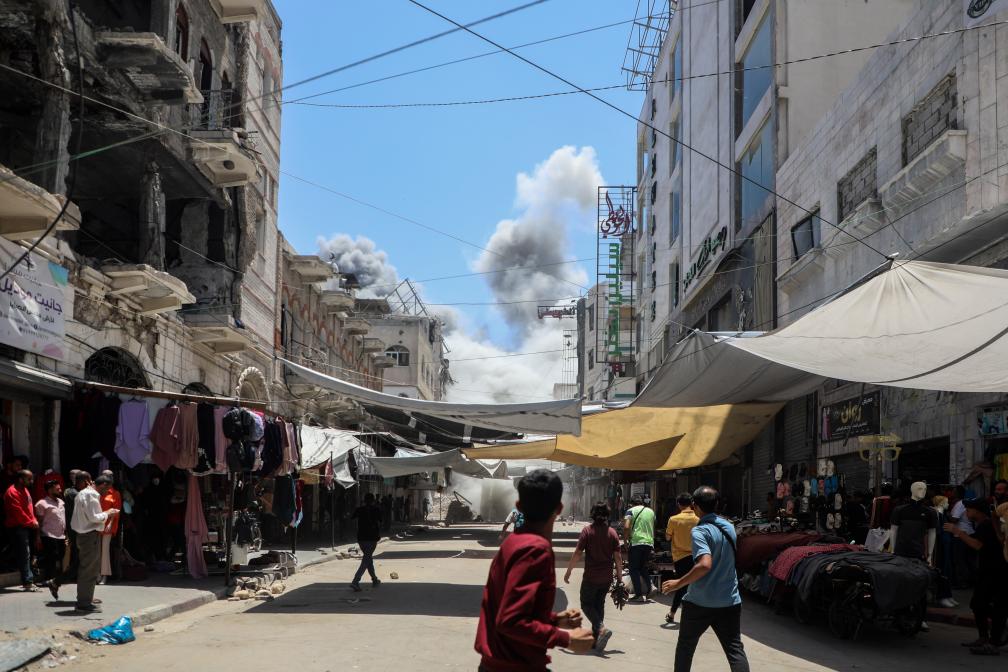 5月31日,在加沙城,人們望向以軍襲擊後升起的濃煙。新華社發(裏澤克·阿卜杜勒賈瓦德攝)
