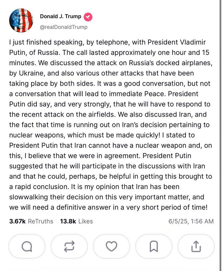 特朗普4日在社交媒體上説,他與普京討論了烏克蘭對俄戰略轟炸機的襲擊,以及俄烏雙方正在展開的“各種相互襲擊”。普京“態度非常堅決地”表示將對俄機場遭襲事件作出回應。