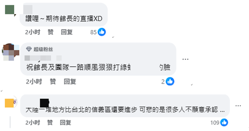 5日,“館長”在臉書發圖文表示其台胞證已經拿到,有島內網民在該帖文下留言,期待他此次在大陸進行直播旅遊,“贊喔~期待館長的直播”“祝館長及團隊一路順風,狠狠打綠營的臉”“大陸的一堆地方比台北的信義區還要進步,可悲的是很多人不願意承認……”