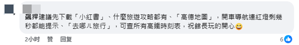 還有島內網民為其支招,“飆捍,建議先下載‘小紅書’,什麼旅遊攻略都有,‘高德地圖’開車導航連紅綠燈剩幾秒都能提示,‘去哪兒旅行’可查所有的高鐵時刻表,祝館長玩得開心”。