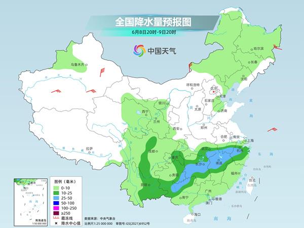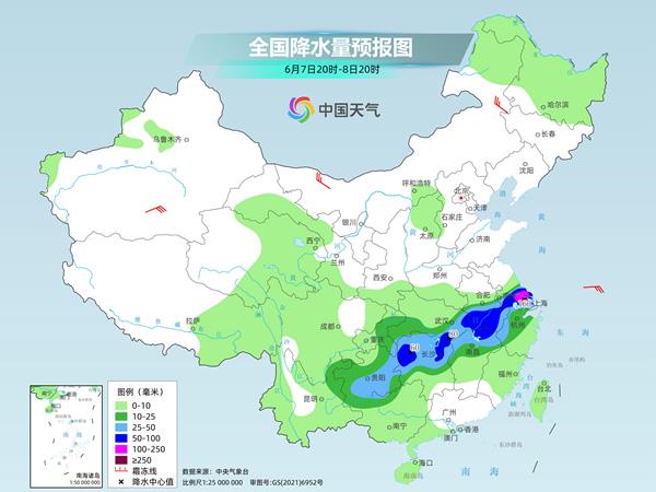 7日夜間至8日,湖南西部和東北部、湖北東南部、安徽中南部、江西北部、江蘇南部、上海等地部分地區有暴雨或大暴雨。