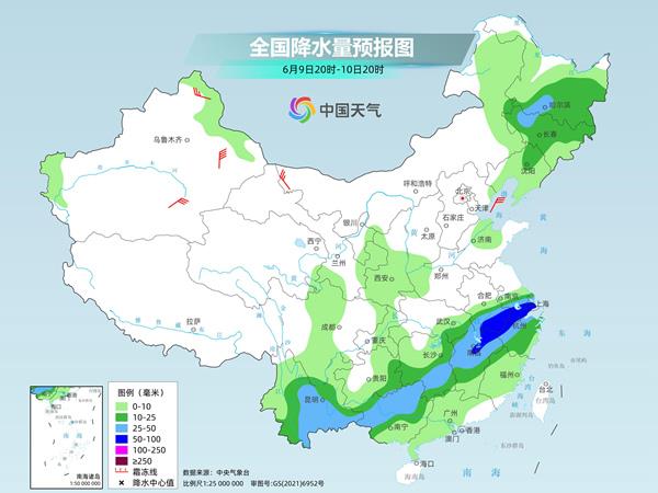 9日至10日,雨帶大致呈現東北—西南走向,其中,10日安徽南部、江蘇南部、上海、浙江北部、江西北部等地有大到暴雨。