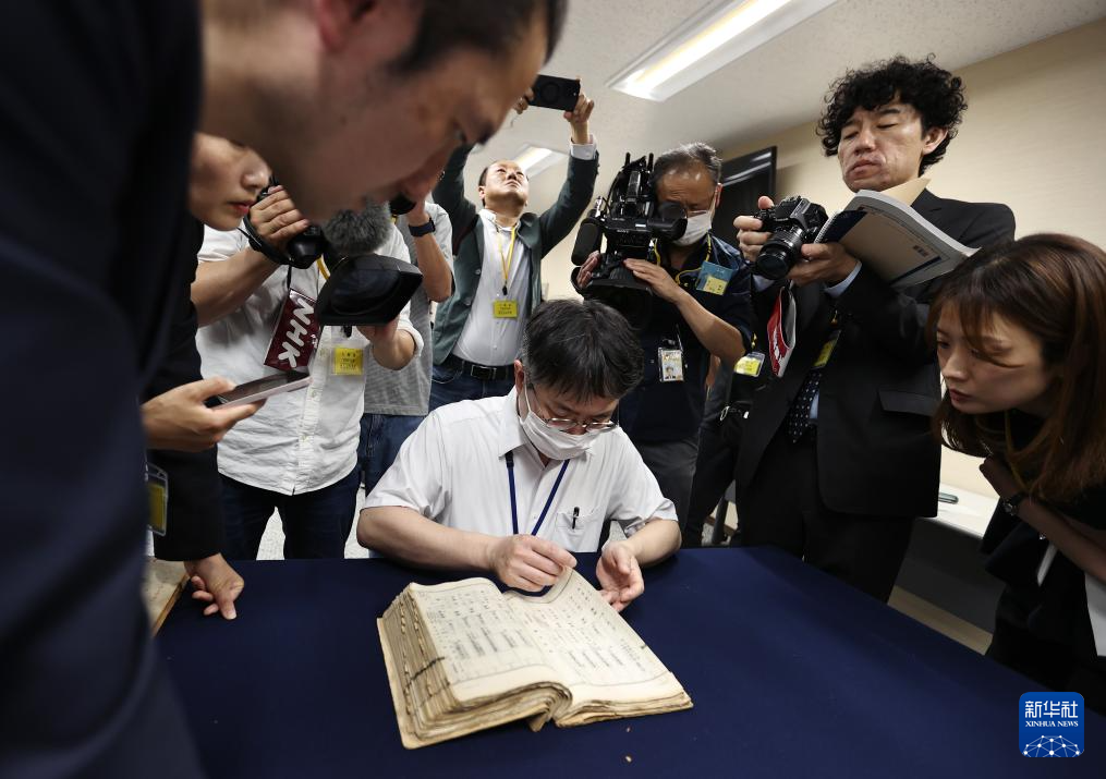 5月14日,在日本東京,工作人員在日本國立公文書館翻閲侵華日軍細菌戰部隊“登字1644部隊”留守名簿,尋找寫有竹上勝利父親宮下利市的文字記錄。新華社記者 賈浩成 攝