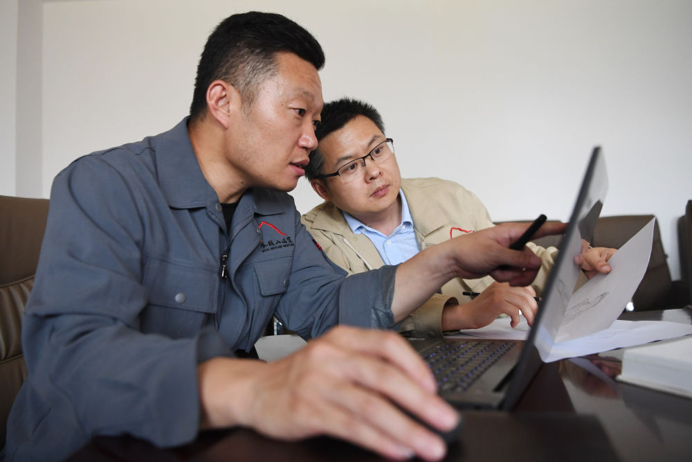 麥積山石窟藝術研究所副所長張銘(左)和同事修改完善《麥積山石窟考古報告》。新華社記者 陳斌 攝