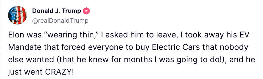 似乎是回應馬斯克的批評,美國總統特朗普隨後又在其社交媒體平台“真實社交”上發文稱,埃隆·馬斯克已開始“失去耐性”。特朗普稱他要求馬斯克離開,撤銷了馬斯克強推的電動汽車“強制令”,結果“馬斯克瘋了”。