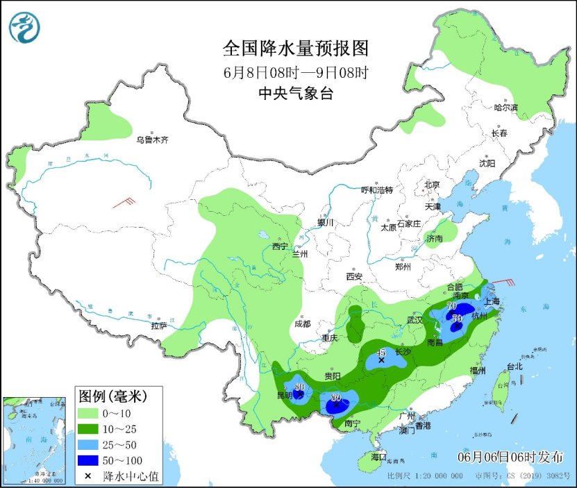 預計6日夜間至10日,較強降雨將主要出現在江漢、江淮、江南等地,其中,湖北東部、安徽南部、江蘇南部、上海、浙江西北部、江西東北部等地部分地區有暴雨,局地大暴雨,累計降水量80~160 毫米,局地220毫米以上。降雨最強時段在6日夜間至7日,8日雨帶南壓,強度有所減弱。