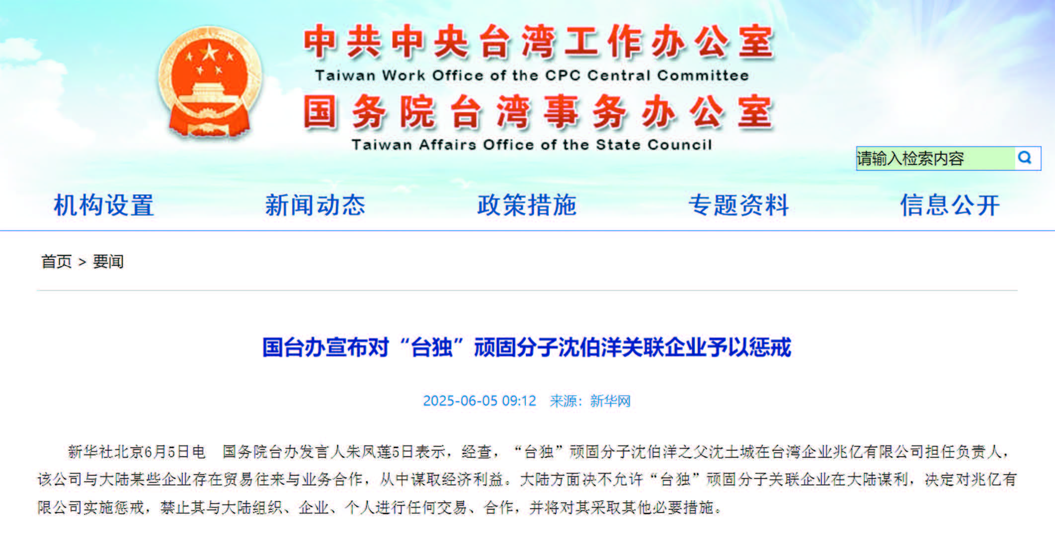 國務院台辦發言人朱鳳蓮5日表示,經查,“台獨”頑固分子沈伯洋之父沈土城在台灣企業兆億有限公司擔任負責人,該公司與大陸某些企業存在貿易往來與業務合作,從中謀取經濟利益。大陸方面決不允許“台獨”頑固分子關聯企業在大陸謀利,決定對兆億有限公司實施懲戒,禁止其與大陸組織、企業、個人進行任何交易、合作,並將對其採取其他必要措施。