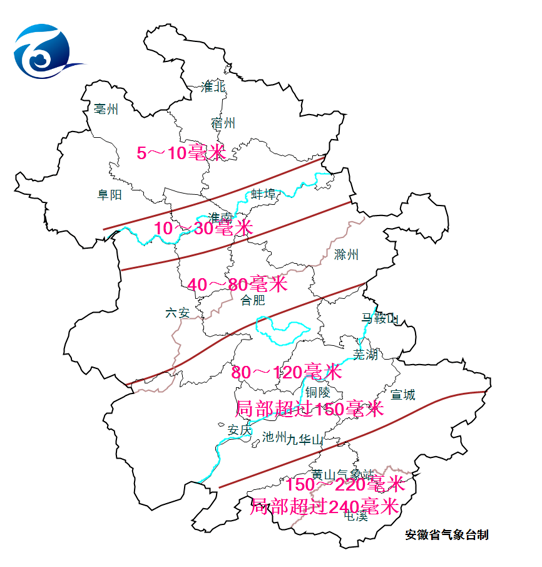 淮北地區5~10毫米;沿淮地區10~30毫米;江淮之間北部40~80毫米;江淮之間南部到江南北部80~120毫米,局部超過150毫米;江南南部(黃山市、宣城、池州)150~220毫米,局部(黃山市)超過240毫米。