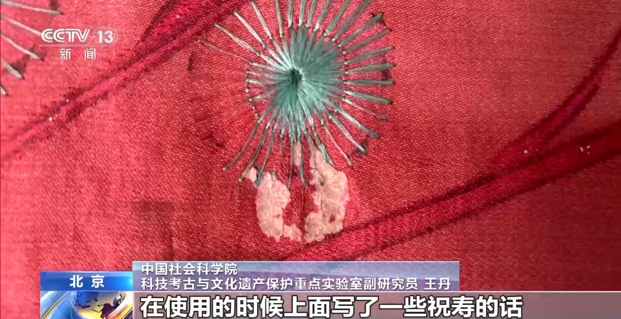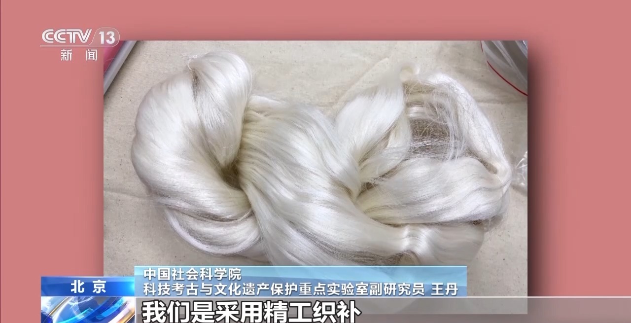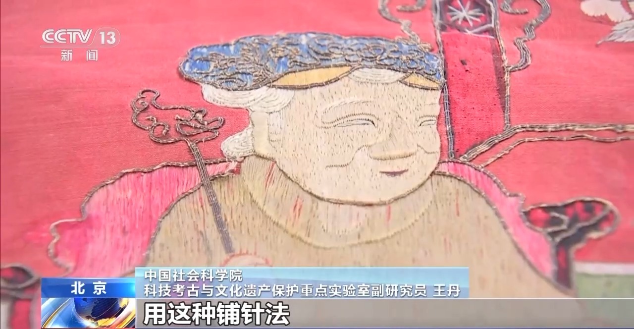 *中國社會科學院科技考古與文化遺產保護重點實驗室副研究員王丹:*它是緞面的幛子,蠶絲線很細,但是特別容易斷。用這種鋪針法,把它的位置一針針固定住,行距大概在1.5毫米,按照國際的修復理念叫作“遠看一致近觀有別”。