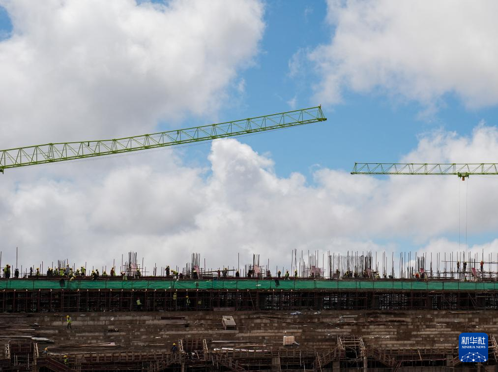 這是坦桑尼亞北部城市阿魯沙的一片繁忙工地:六座高聳的塔吊伸展着鋼鐵巨臂,在高空精準吊運建材;焊接聲、機械轟鳴聲與指令聲此起彼伏,交織成一首建設交響曲;上千名工人頭戴安全帽、身着反光背心,正全力拉滿施工“進度條”……一座現代化體育場已初具雛形。