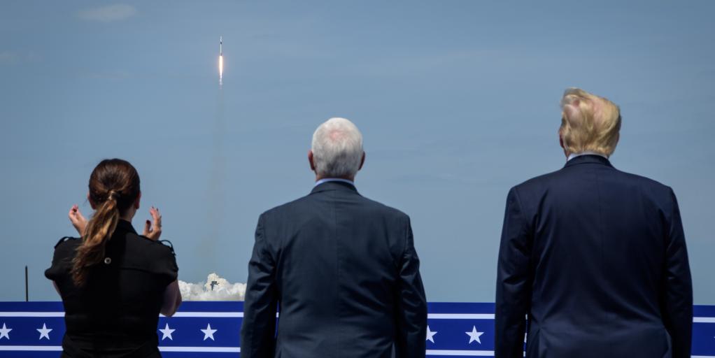 2020年5月30日,在美國佛羅里達州肯尼迪航天中心,美國總統特朗普(右)和美國副總統彭斯(中)等觀看載人版“龍”飛船搭乘“獵鷹9”火箭升空。這是自2011年以來美國首次使用國產火箭從本土將宇航員送往國際空間站。新華社發(美國國家航空航天局供圖)