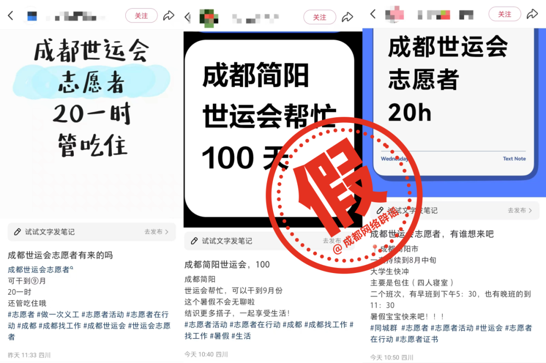 近日,個別網民在社交平台借“成都世運會志願者”名義發佈兼職招聘廣告,內容包括工作內容、工作時間、時薪、住宿等,引發網民關注和討論。