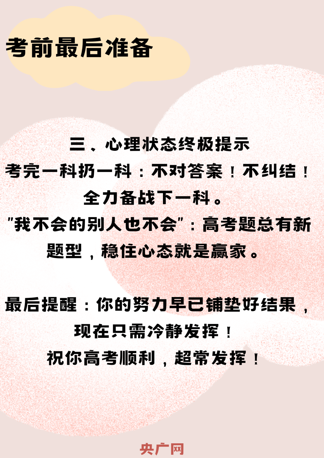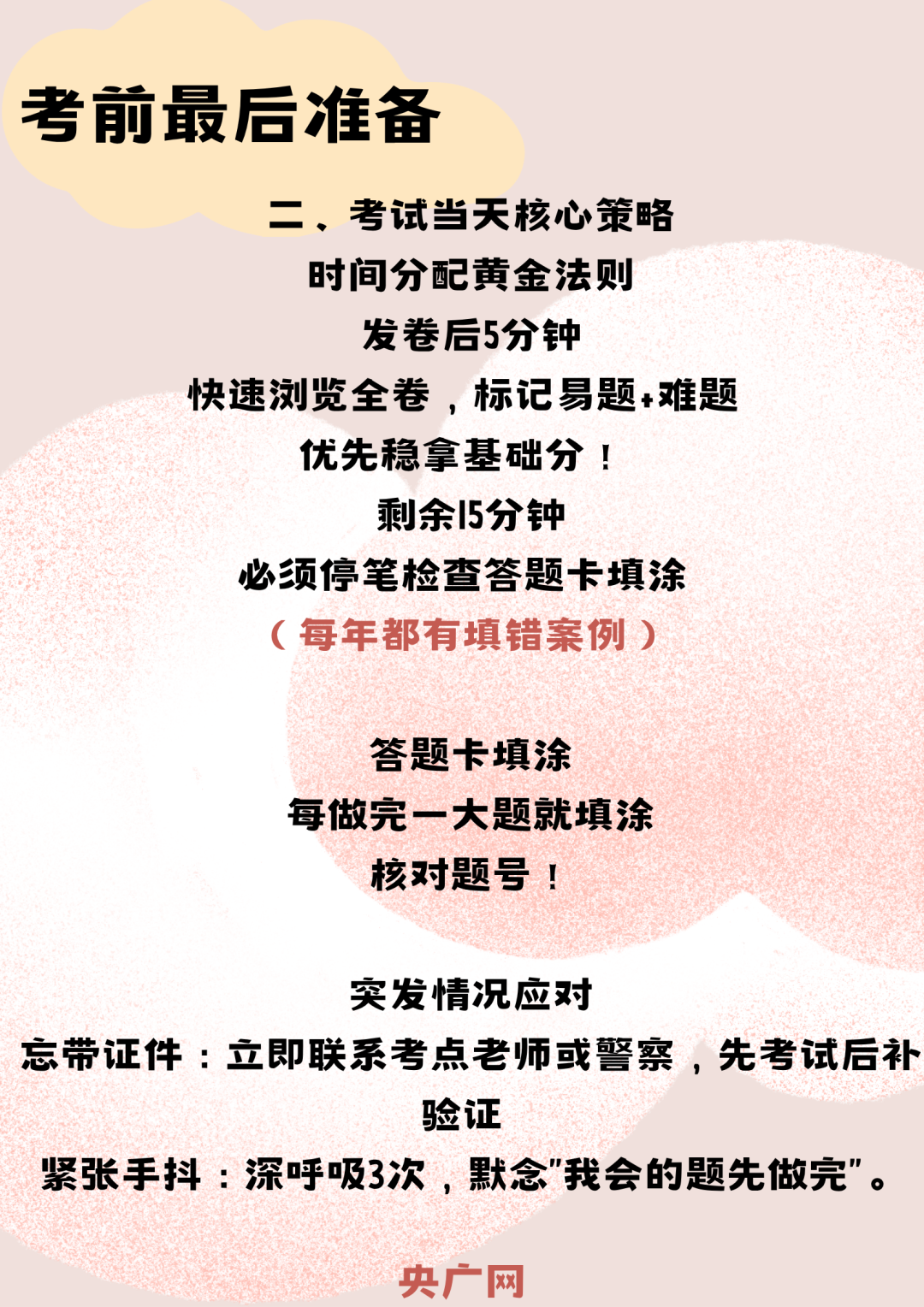 為確保各位考生順利應考、穩定發揮,央廣網特別整理了這份考前準備與考場應對指南。內容涵蓋證件準備、考場規則、時間分配、應急處理等關鍵環節,幫助大家做好萬全準備,從容應考。