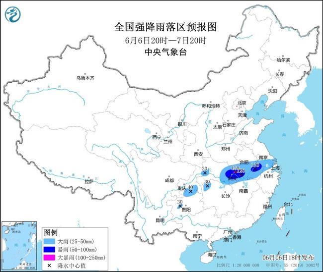 預計,6月6日20時至7日20時,湖北中東部、河南東南部、安徽中南部、江蘇南部以及湖南北部、重慶東部和南部、貴州北部等地的部分地區有大到暴雨,其中,湖北東部、安徽南部等地局地有大暴雨(100~130毫米);上述部分地區伴有短時強降水(最大小時降雨量30~50毫米,局地可超過80毫米),局地有雷暴大風等強對流天氣。