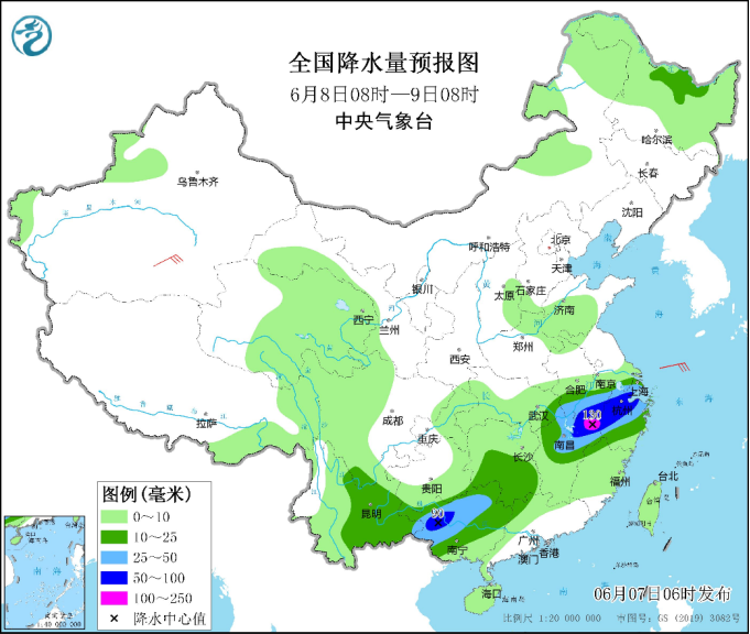 中央氣象台今晨繼續發佈暴雨藍色預警:預計今天,湖北東部和南部、安徽中南部、江蘇南部、上海、湖南西部和北部、江西北部、浙江西部和北部、貴州東部和南部、廣西西北部等地部分地區有大到暴雨,其中,江蘇南部等局地有大暴雨(100~150毫米)。上述部分地區伴有短時強降水(最大小時降雨量30~60毫米,局地可超過80毫米),局地有雷暴大風等強對流天氣。