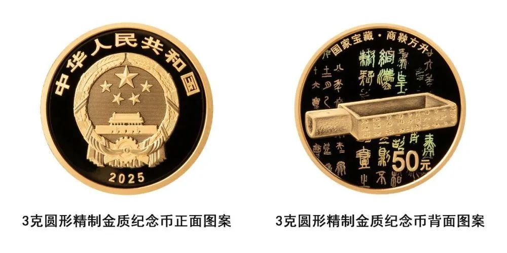3克圓形金質紀念幣背面圖案為商鞅方升造型,襯以商鞅方升局部銘文字樣,並刊“國家寶藏·商鞅方升”字樣及面額,最大發行量5000枚。