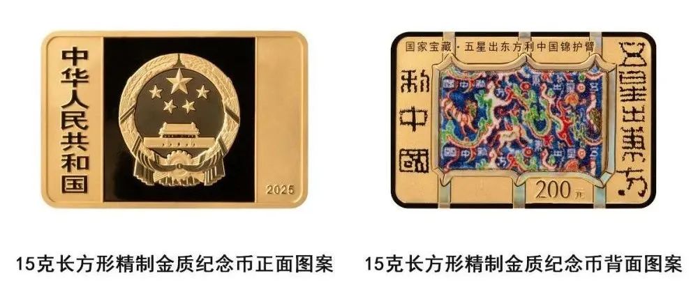 15克長方形金質紀念幣背面圖案為五星出東方利中國錦護臂造型,及“五星出東方利中國”字樣,並刊“國家寶藏·五星出東方利中國錦護臂”字樣及面額,最大發行量2000枚。