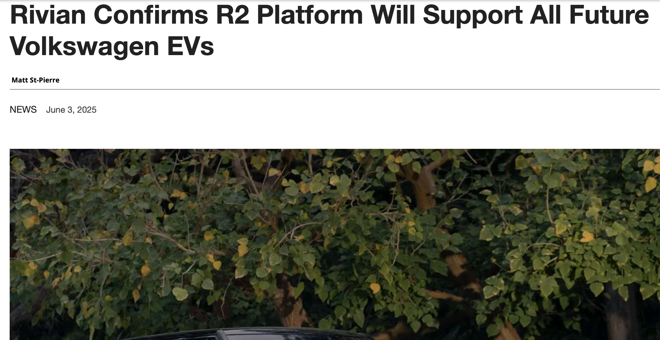 這意味着大眾未來在電動車領域的產品線將全面基於Rivian R2車型的技術架構開發,標誌着雙方合作從戰略層面進入實質落地階段。