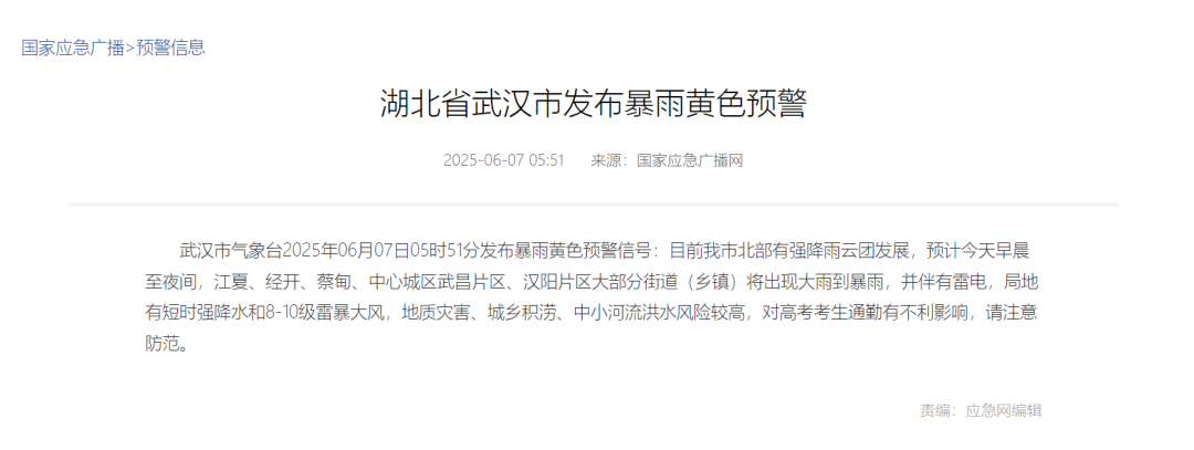 大暴雨+雷暴大風!武漢連發多條預警,考生和家長請注意
