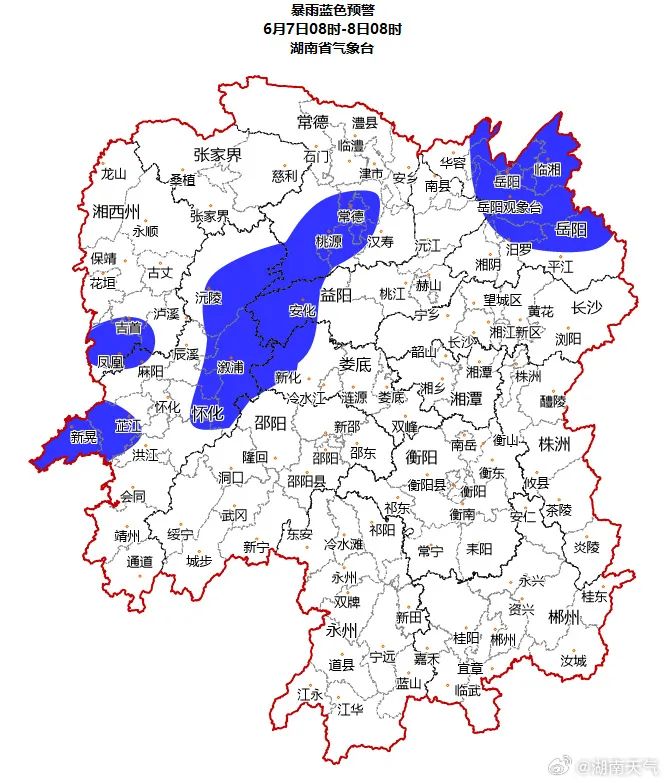 湖南省氣象台06月07日06時發佈暴雨藍色預警:預計7日08時至8日08時,岳陽、常德南部、益陽西南部、懷化東北部、婁底西北部、湘西州西南部將出現暴雨,並伴有短時強降水、雷雨大風等強對流天氣,請加強防範。