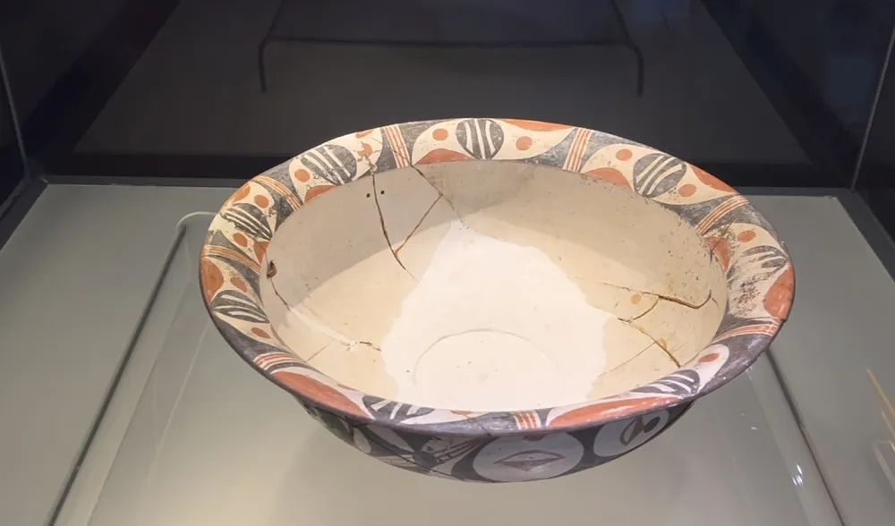 這件白衣彩陶盆並非完整無缺,器身有先民修補的痕跡。在盆身裂縫旁,先民們鑽出一些兩兩相對的小孔,並用金屬將之補齊,這和數千年後才出現的鋦工藝較為類似。