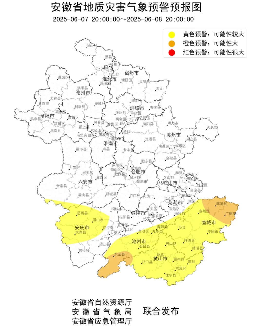 6月7日,安徽省自然資源廳、安徽省氣象局、安徽省應急管理廳聯合發佈地質災害橙色預警: