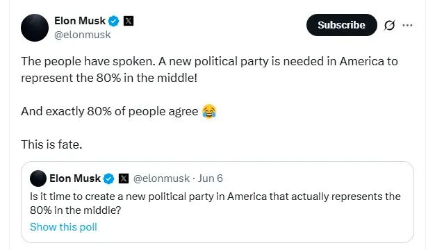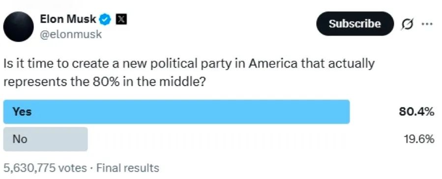 據瞭解,馬斯克於5日首次提出這一想法。他在社交平台上向2.2億粉絲髮起投票,詢問是否同意“是時候在美國創建一個真正代表80%中間派的新政黨了”。