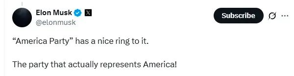 馬斯克於6日晚間發文稱:“這是命運”。隨後,馬斯克還表示贊同一位粉絲提出的黨名建議——“美國黨” (America Party)。
